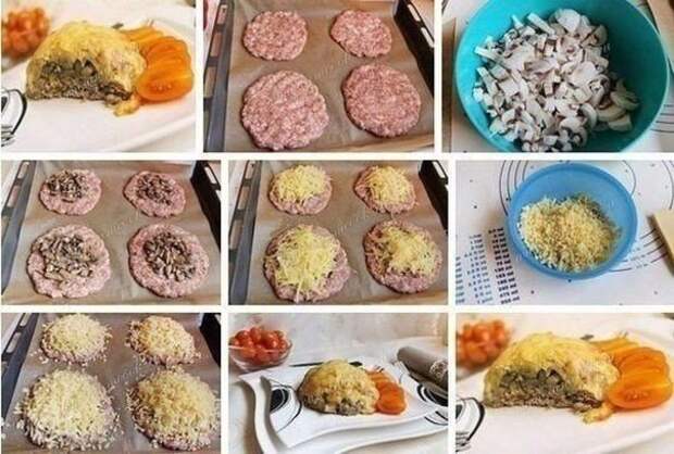 Конечно, такие котлеты можно приготовить и на обед, и на ужин, но они по праву займут достойное место на праздничном столе. По сути - обычные котлетки, однако они действительно похожи на маленькие сугробы. В основании - мясной фарш, затем слоями выкладывается начинка. А на ней слоями - обжаренные шампиньоны, картофель, тёртый сыр. И всё это изобилие поливается майонезом. Вкуснотища, одним словом!