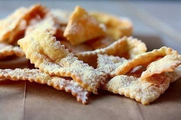 Готовый хворост достаем, даем стечь лишнему маслу, выкладываем на тарелку и посыпаем сахарной пудрой