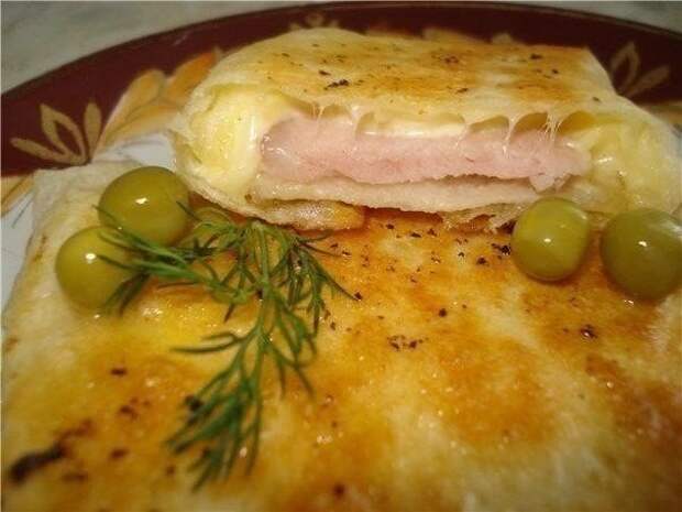 нарезаем на квадратики. Середину смазываем майонезом, натираем сыр на терке, сверху кладем ломтик ветчины. Заворачиваем конвертом и жарим на сковородке с обеих сторон (сначала сложенной стороной, а потом гладкой)