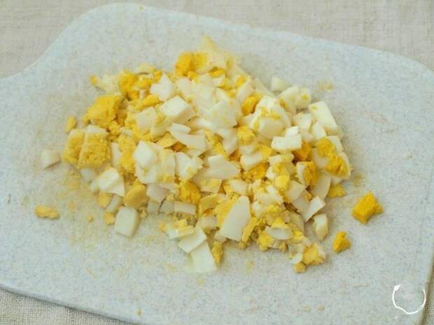 Нарезать кубиками варёные яйца.